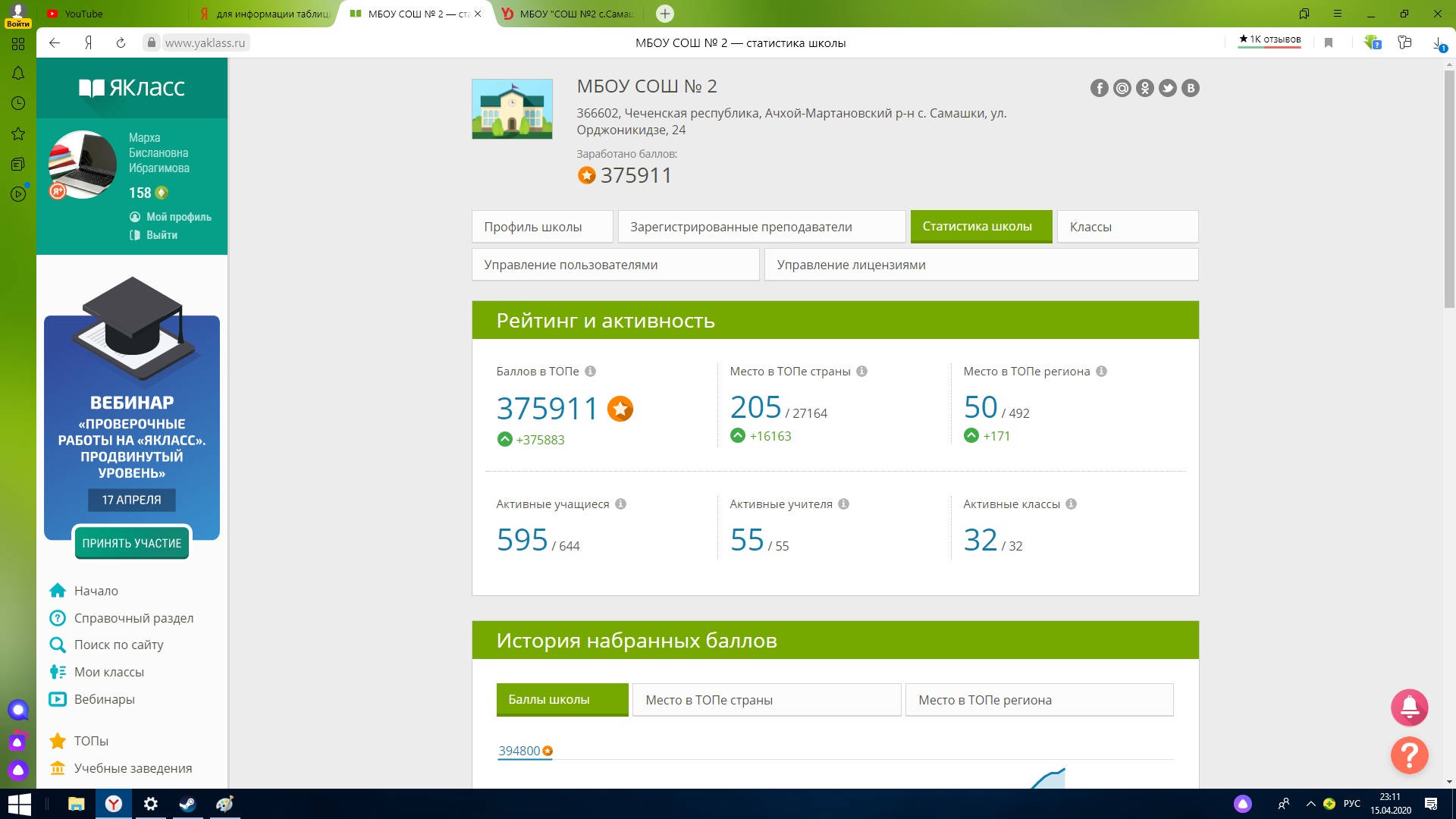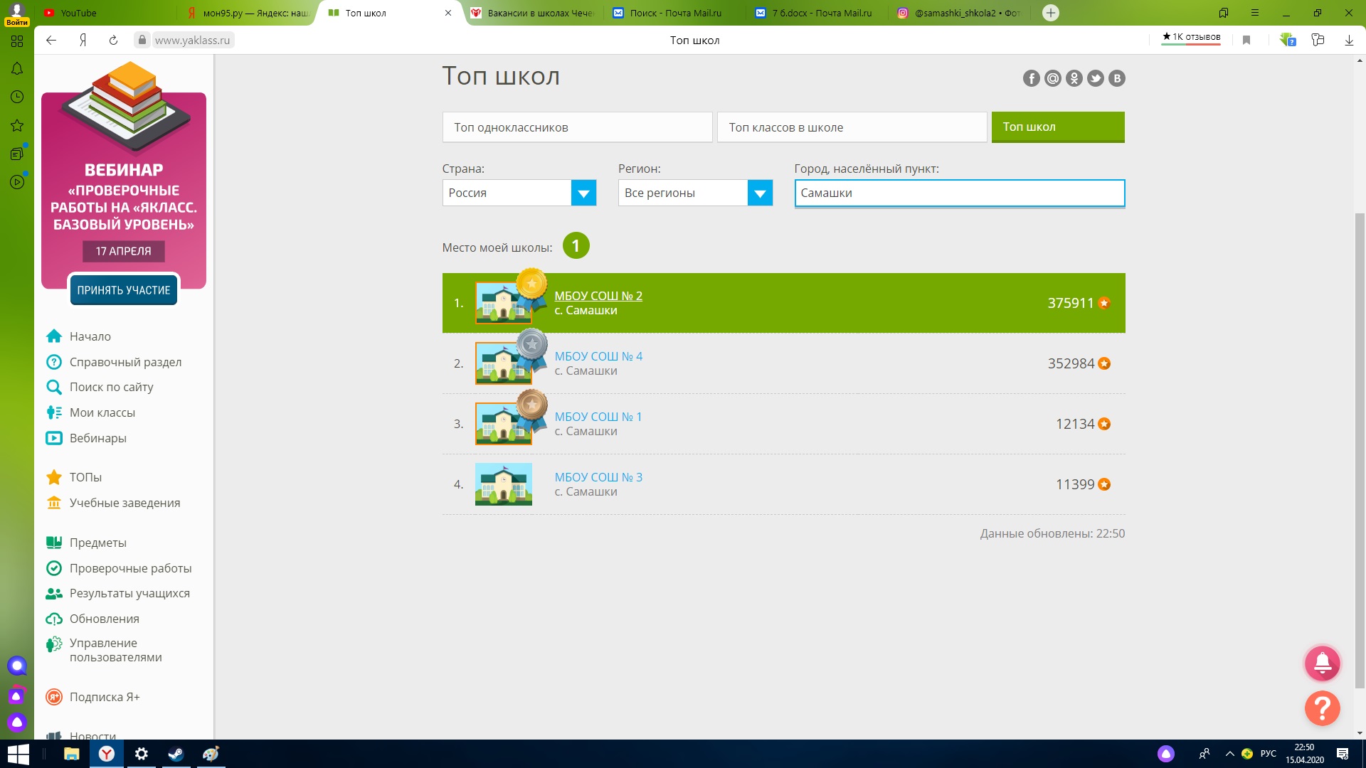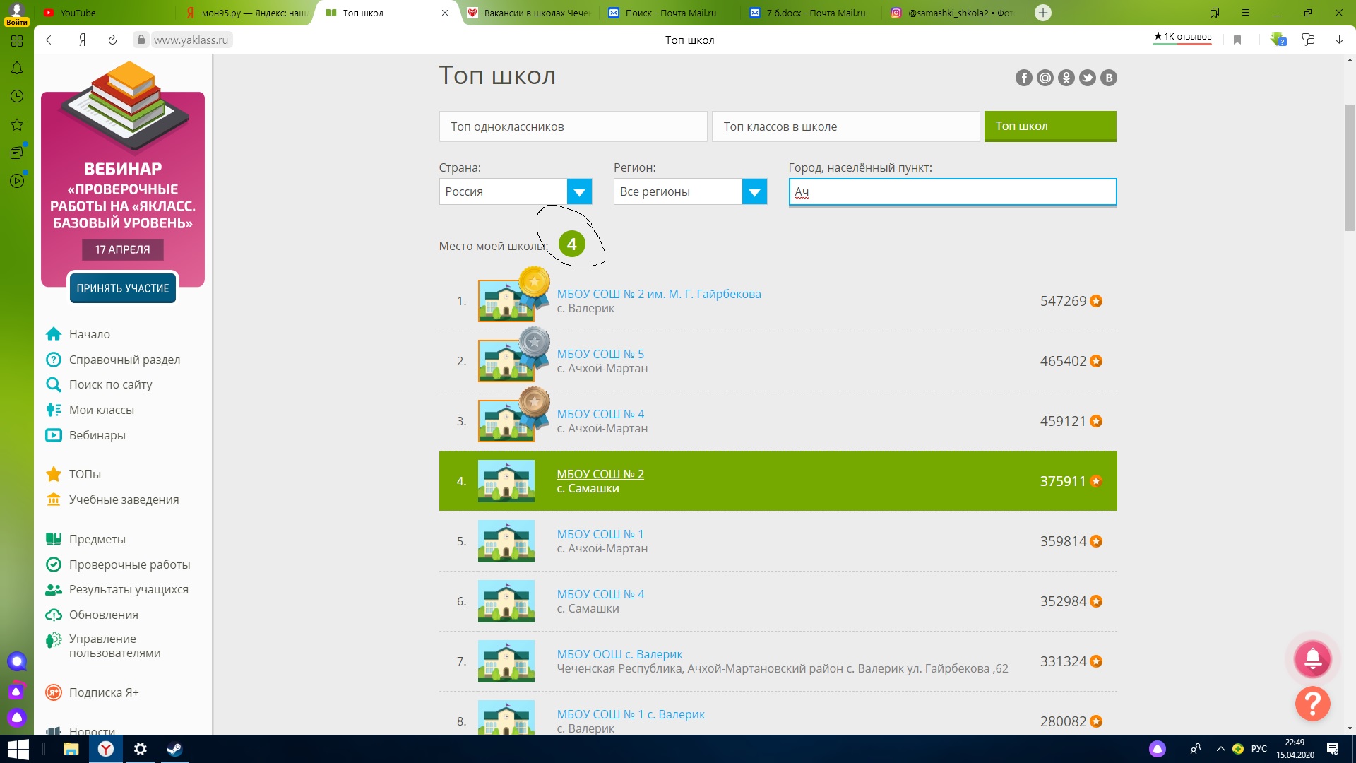 На портале якласс работает школа, данный момент занимает 1 место среди школ в селе Самашках
