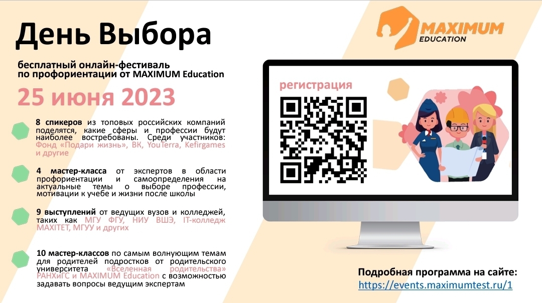 06.06.2023Информируем вас о проведении и возможности принять участие учащимся 5–11 классов и их родителям в бесплатном фестивале по профориентации «День Выбора», который пройдет в онлайн-формате 25 июня 2023 года. Организатором фестиваля является MAXIMUM Education – российская образовательная IT-компания, которая более 10 лет обучает школьным предметам, а также реализует бесплатные программы, направленные на улучшение успеваемости школьников, их профессиональную ориентацию, приобретение новых навыков и на эффективное участие родителей в образовательном процессе.