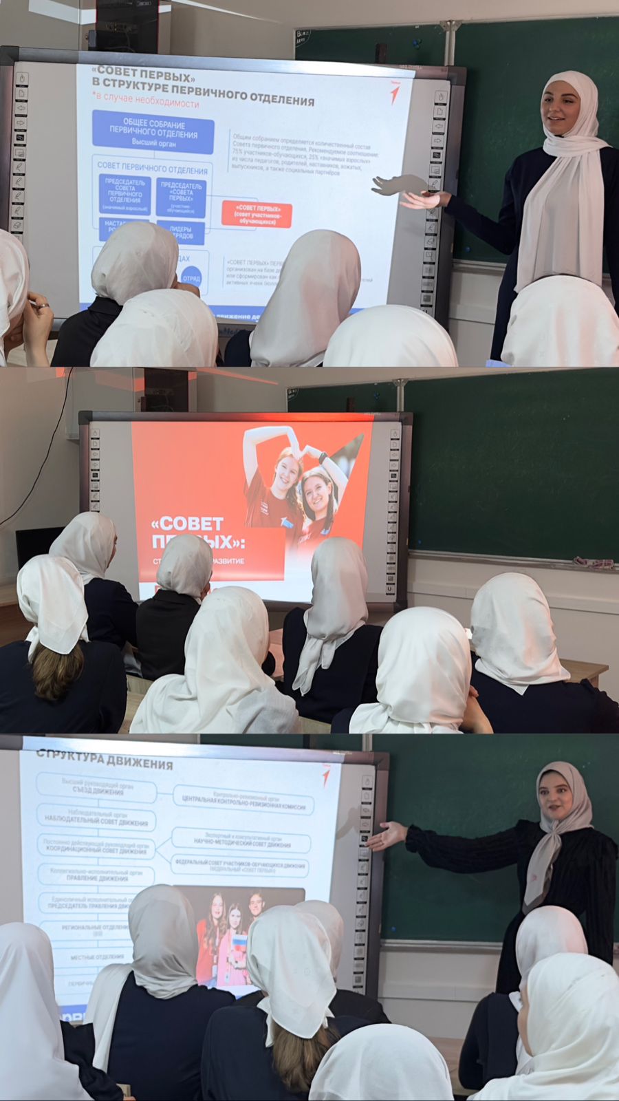 В МБОУ «СОШ 2 с.Самашки» председатель совета первых показала учащимся презентацию РДДМ. Председатель разобрала с учащимися должности участников проекта «совет первых», поговорили об их обязанностях, а также правах.