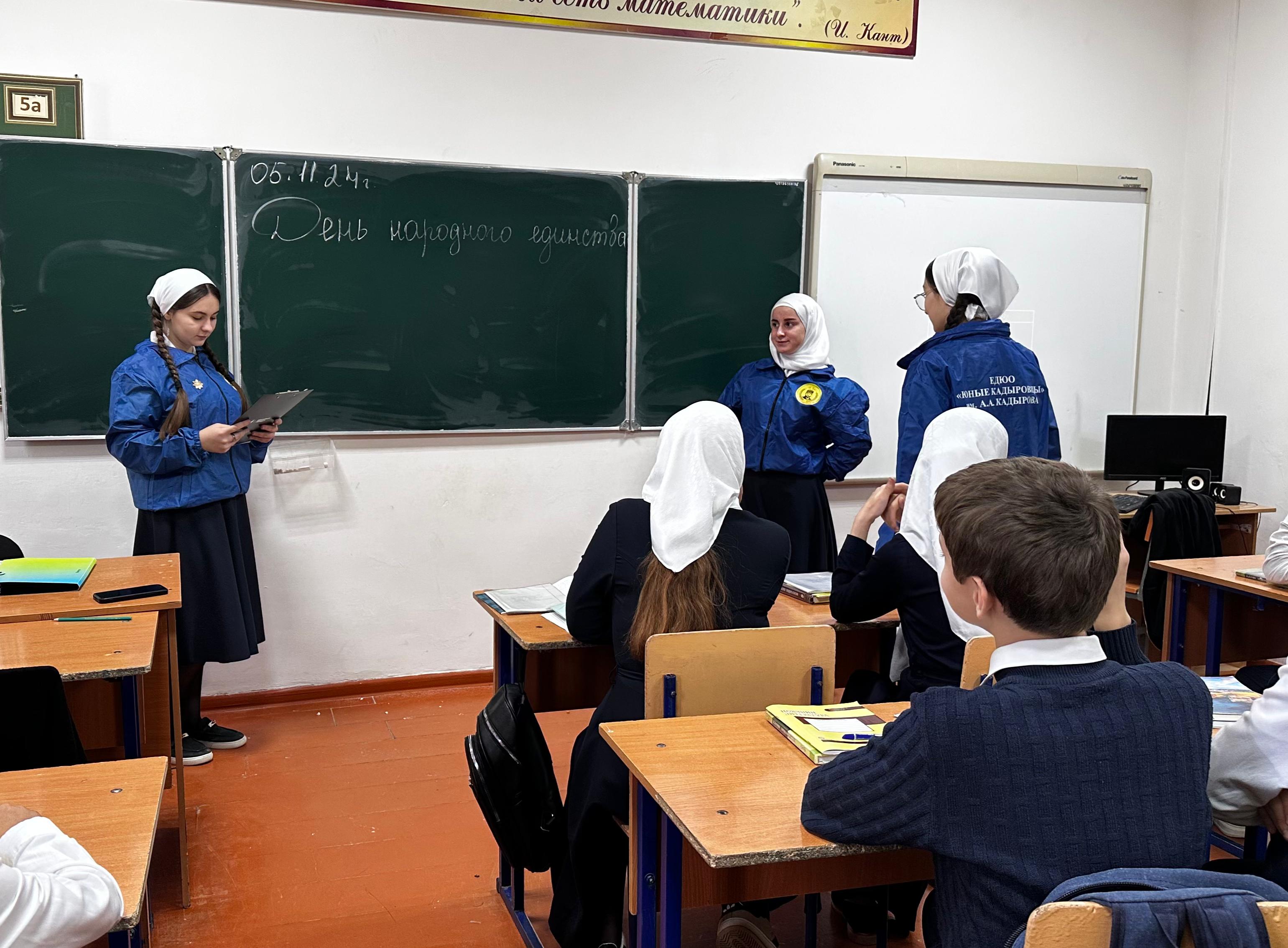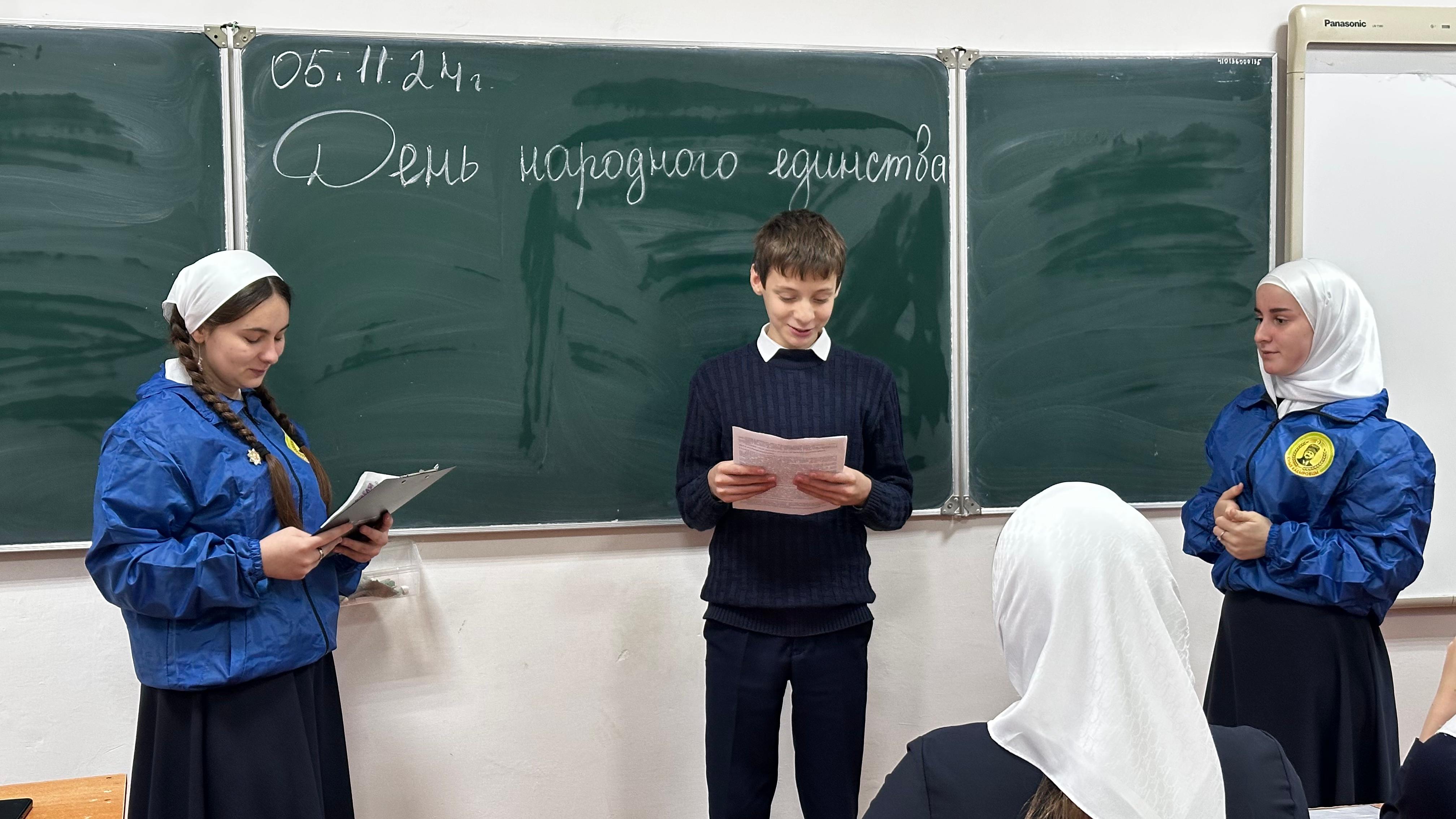 С целью формирования у детей представлений об истории России, ее героическом прошлом, а также с целью расширения представлений детей о народах населяющих Россию, отрядом «Юные Кадыровцы» в МБОУ «СОШ №2 с.Самашки» были проведены классные часы, посвящённое Дню народного единства.