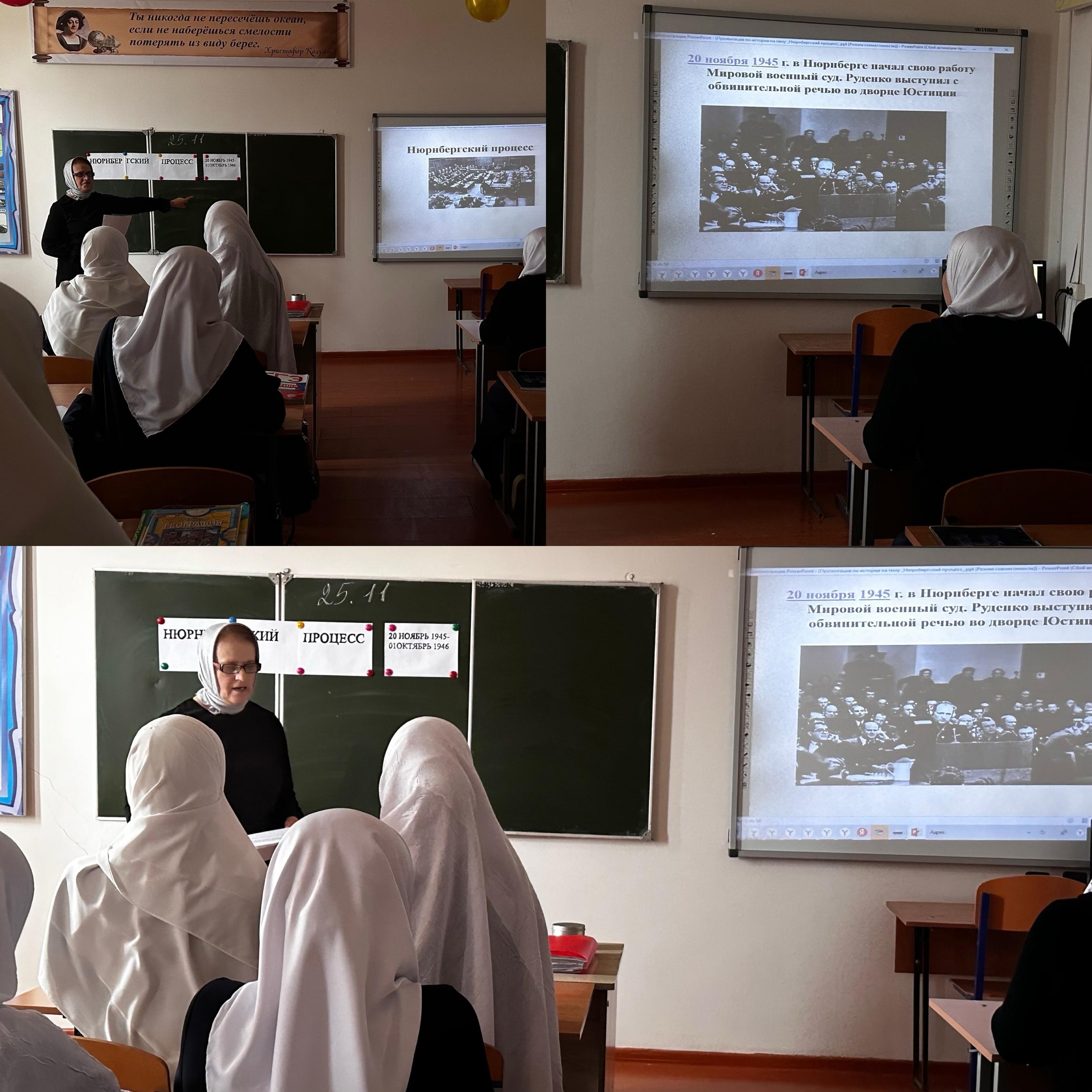 Учитель истории Хучбарова Р.Х. обучающимся 11 класса напомнила о решениях Нюрнбергского процесса, безоговорочно осудивших фашизм и его преступления против мира и человечества во время Второй мировой войны.