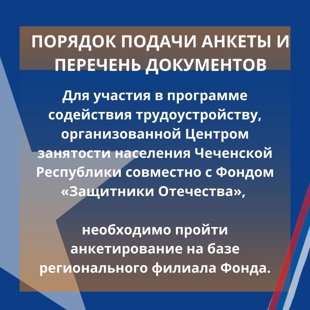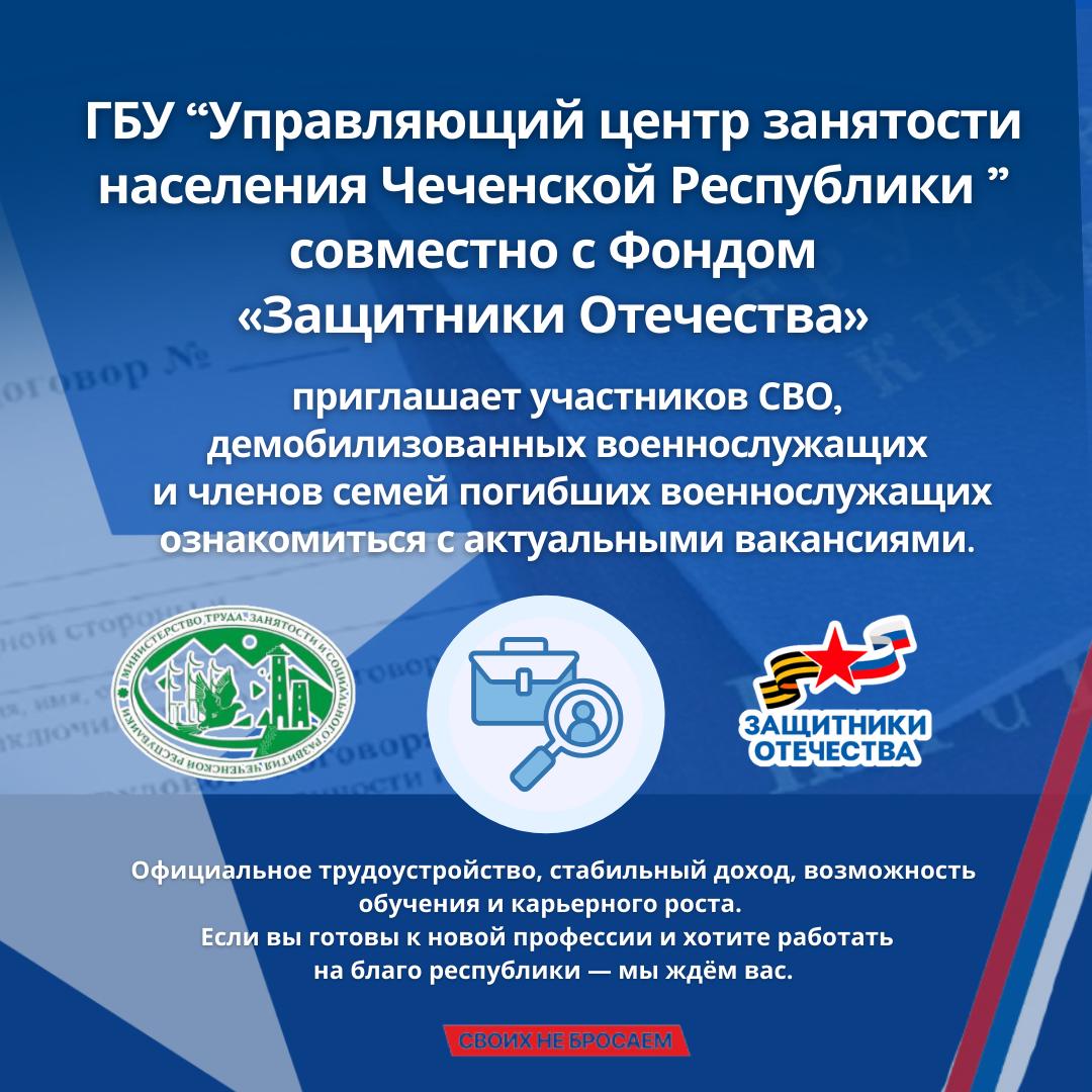 Филиал Государственного Фонда поддержки участников специальной военной операции «Защитники Отечества» в Чеченской Республике совместно с Государственным бюджетным учреждением «Управляющий Центр занятости населения» Министерства труда, занятости и социального развития ЧР объявляет о проведении мероприятия по содействию трудоустройству ветеранов СВО, демобилизованных военнослужащих и членов семей погибших защитников Отечества.