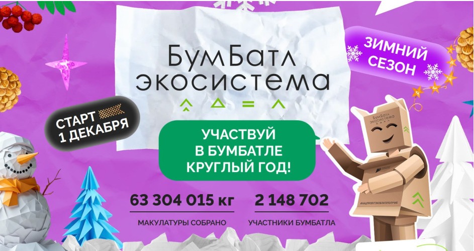 Зимний сезон БумБатла пройдет с 1 декабря по 28 февраля 2026 года. Помимо сбора макулатуры участники смогут побороться за призы в творческом конкурсе «Новогодняя эко-игрушка от «БумБатла». Участники будут создавать ёлочные игрушки из старых газет, журналов, картона и другой ненужной бумаги, превращая отходы в украшения.